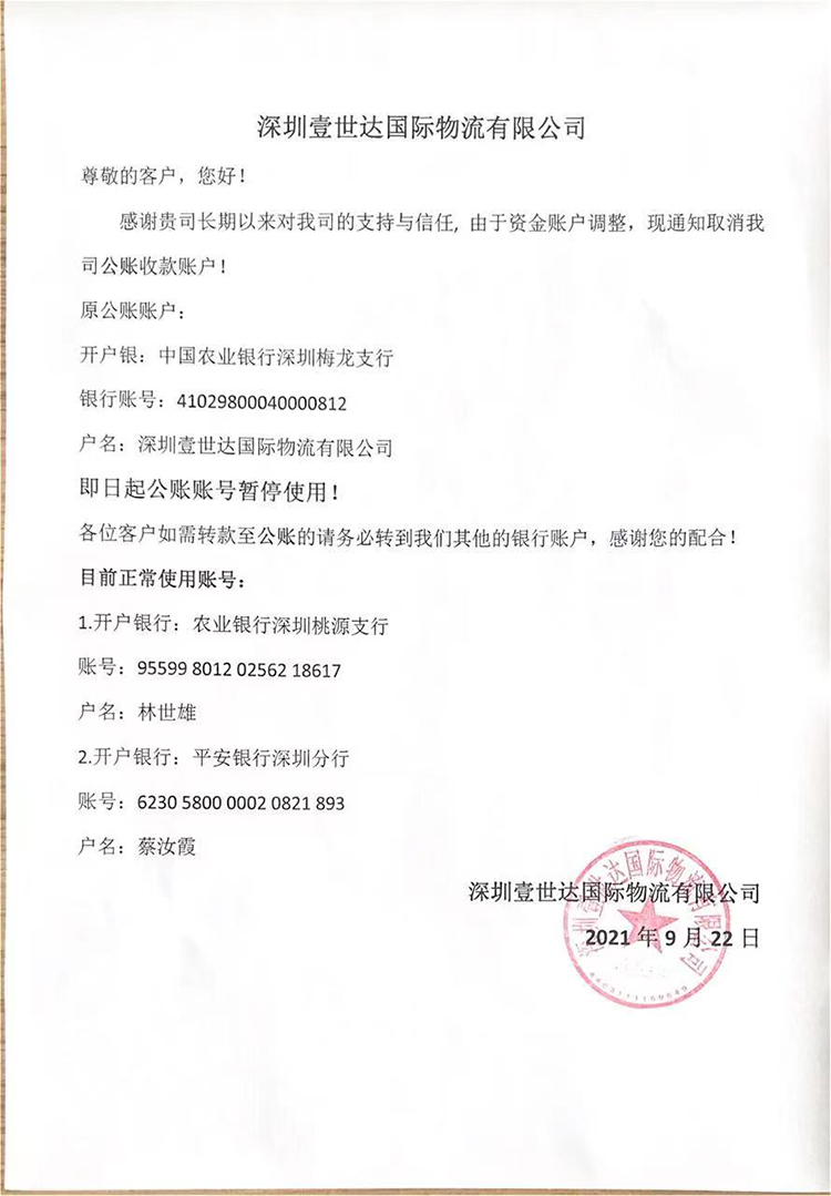 【壹世達(dá)】對(duì)公賬戶暫停使用通知