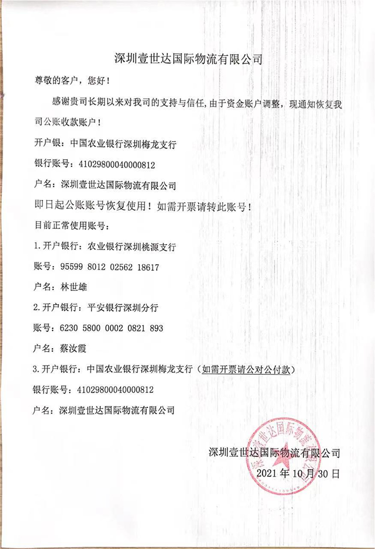 【壹世達(dá)】恢復(fù)對(duì)公賬戶收款通知