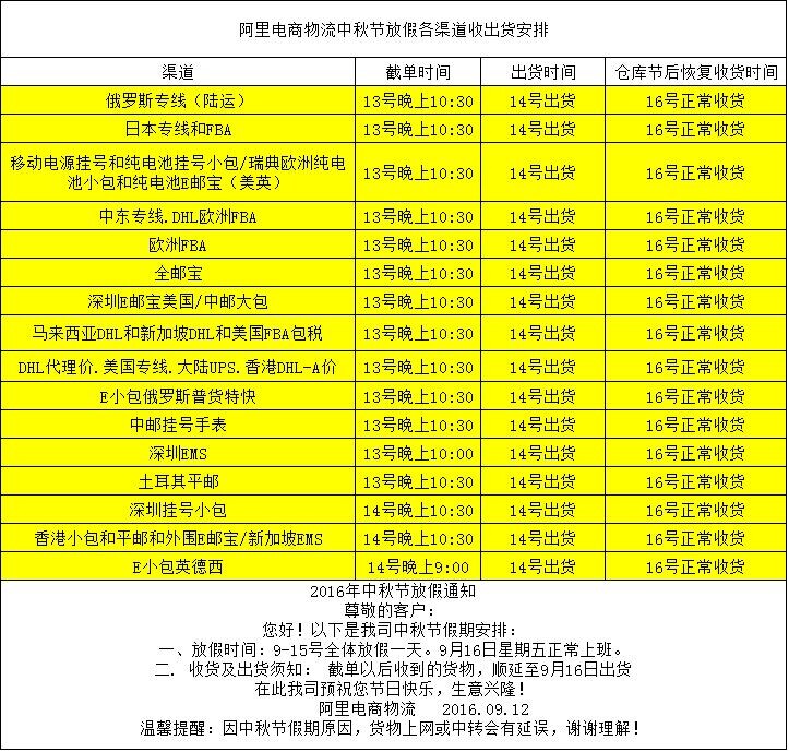 您好!以下是我司2016年中秋假期各渠道收出貨時間安排。