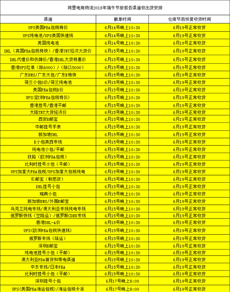 2018年6月 18日(周一)全體放假一天,6月19號(周二)正常上班,放假期間我司無人值班收貨(16日、17日跟平時一樣值班)。
