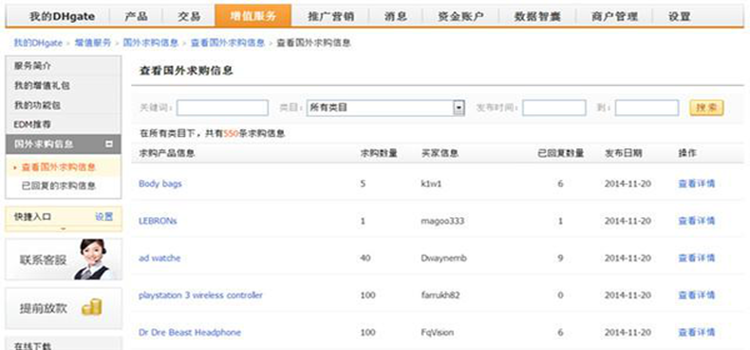 在敦煌網(wǎng)上,賣家進(jìn)入“我的DHgate”,點(diǎn)擊“增值服務(wù)--國外求購信息”,在這里可以查看到部分外國客戶的求購信息,對于賣家選品也有一定的參考價值。