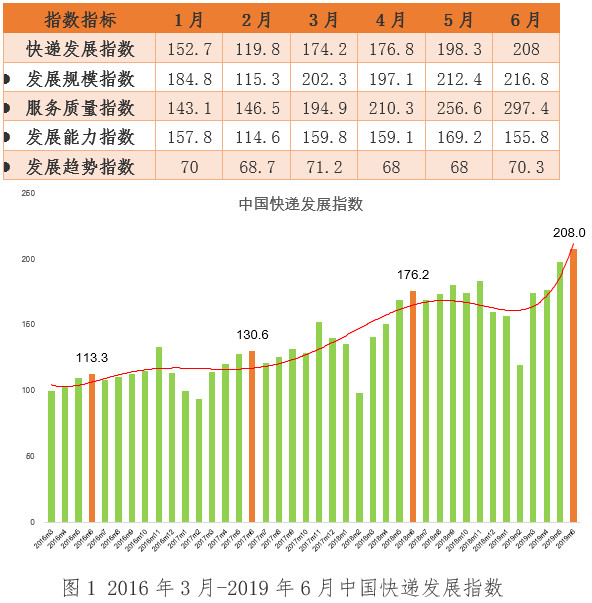7月9日,國(guó)家郵政局發(fā)布2019年6月中國(guó)快遞發(fā)展指數(shù)報(bào)告。據(jù)測(cè)算,2019年6月中國(guó)快遞發(fā)展指數(shù)為208,同比提高18%,呈現(xiàn)穩(wěn)中向好的態(tài)勢(shì)。發(fā)展規(guī)模指數(shù)、服務(wù)質(zhì)量指數(shù)和發(fā)展能力指數(shù)分別為216.8、297.4和155.8,分別比上年同期提高了24.8%、23.9%和3.8%,表明我國(guó)快遞市場(chǎng)在發(fā)展規(guī)模、服務(wù)質(zhì)量和發(fā)展能力方面整體提升。發(fā)展趨勢(shì)指數(shù)為70.3,環(huán)比提高3.3%,增長(zhǎng)勢(shì)頭向好。