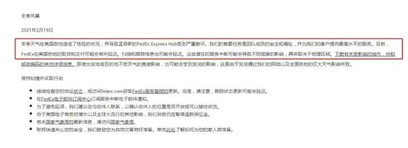 導致派送時效有所延誤,UPS,FedEx和USPS在19號臨時暫停多個州的提貨與派送。美國總統拜登批準德州進入重大災難狀態(tài)。近日,美國得州遭遇極端嚴寒天氣,導致多處斷水斷電,目前電力供應正在逐步恢復,但部分地區(qū)仍面臨飲用水和食品短缺。