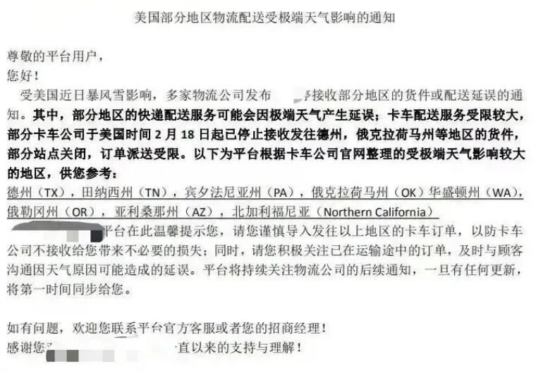 卡車配送服務受限較大,部分卡車公司于美國時間2月18日起已臨時停止接收發(fā)往德州,俄克拉荷馬州等地區(qū)的貨件,部分站點關閉,訂單派送受限。