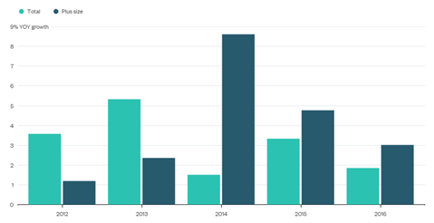 據外媒近日報道,根據NPD的數據顯示,美國大碼服裝銷售額從2013年的174億美元增長到2016年的204億,提高了17%。而這一期間,服裝業(yè)的總銷售額僅增長了7%。下圖為服裝總銷售額和大碼服裝銷售額各自的同比增長率:
