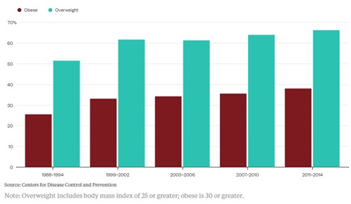 根據數據顯示,美國肥胖女性的比例從1994年的51%增長到2014年的66%。下圖為美國成年女性中的超重和肥胖的人數比例: