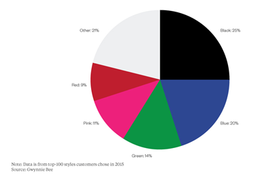 而且根據Gwynnie Bee的數據顯示,現在消費者都在尋找顏色更亮的大碼服裝,下圖是Gwynnie Bee的消費者選擇的服裝顏色比例: