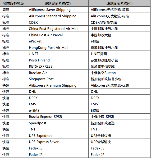 據(jù)速賣通通知了解到,接到俄羅斯郵政通知,部分國家郵政未與俄郵進行數(shù)據(jù)對接,郵件的處理時效無法得到保障,為保障俄羅斯買家的物流體驗和賣家利益,平臺將對發(fā)往俄羅斯國家未對接ITMATT的物流渠道進行管控。2017年07月31日(美國太平洋時間)起,發(fā)往俄羅斯的跨境訂單,標(biāo)準類和快速類僅允許使用如下物流渠道發(fā)貨。