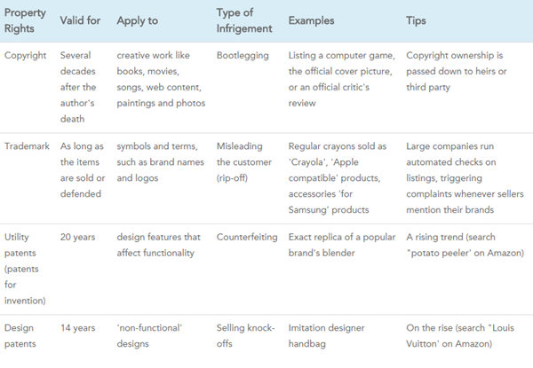 理論上來(lái)講,在平臺(tái)上出售這些產(chǎn)品需要亞馬遜和賣(mài)家共同承擔(dān)責(zé)任。但考慮到平臺(tái)的商業(yè)模式,最近法院規(guī)定亞馬遜無(wú)需為此擔(dān)責(zé)。這就意味著,賣(mài)家需獨(dú)立承擔(dān)侵權(quán)后果。下圖是知識(shí)產(chǎn)權(quán)相關(guān)信息,包括知識(shí)產(chǎn)品類(lèi)型、有效期、適用范圍、侵權(quán)形式等。